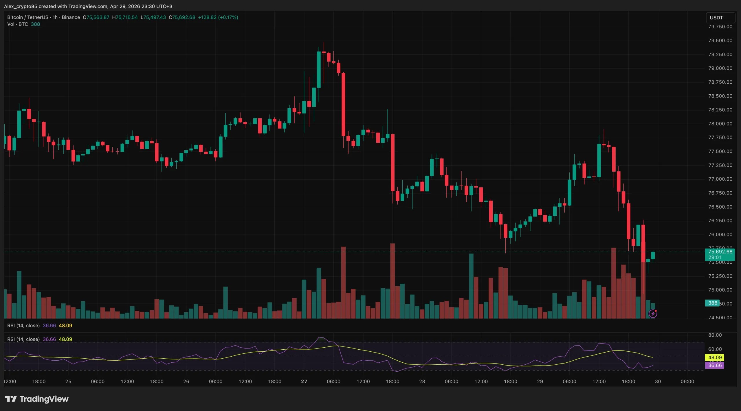 Биткоин в первый час после публикации решения упал примерно с $76 200 до отметок в районе $75 000, затем отскочил до $75 760.