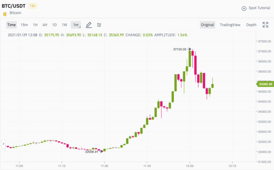 Сразу после сообщения Маска биткоин начал дорожать. В течение получаса после твита миллиардера курс цифровой монеты вырос более чем на 15%, до 37 тыс. Затем цена скорректировалась, на 13.00 по Москве она составляет $36,7 тыс., согласно данным coinmarketcap.com.