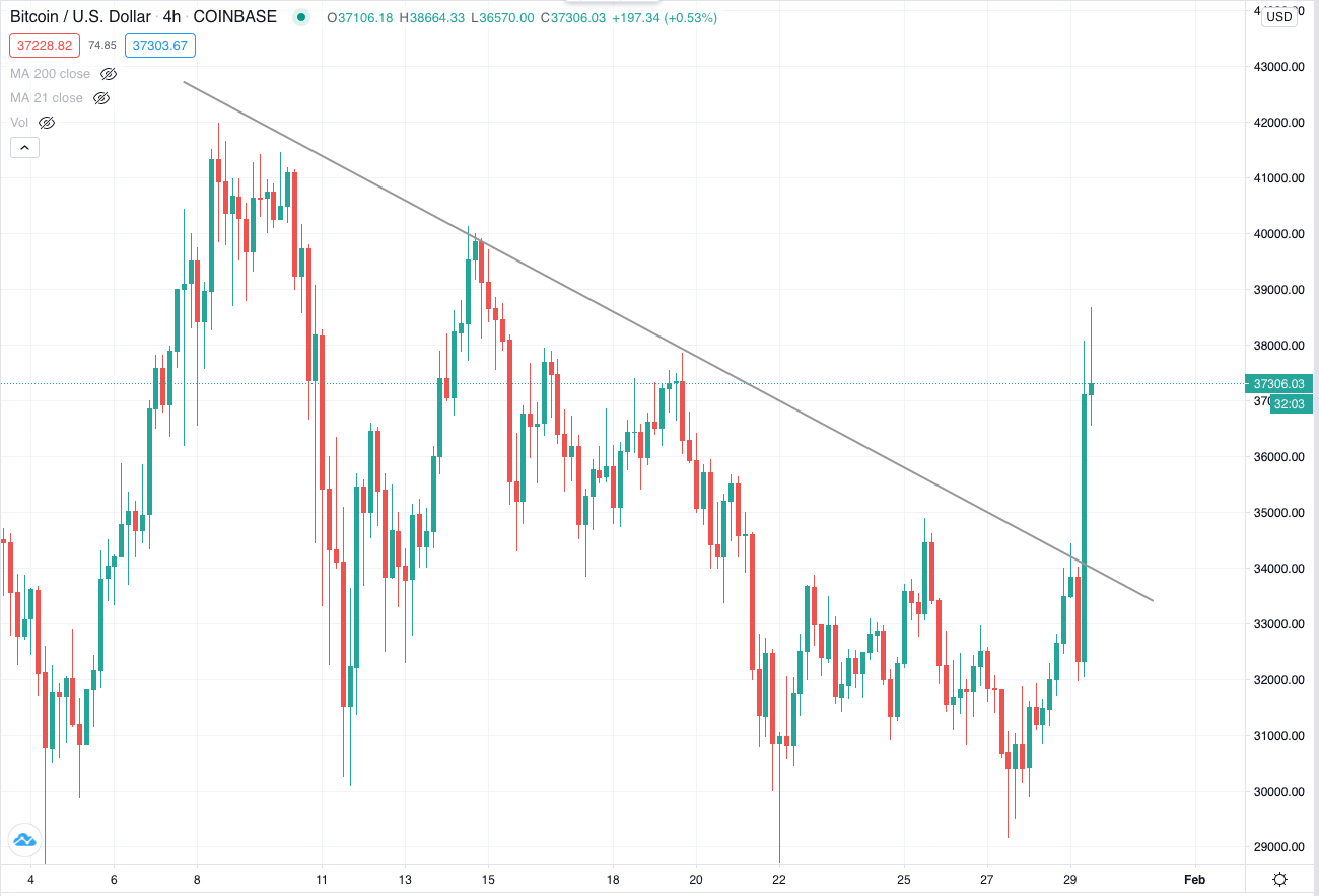 Так или иначе, в 11:24 по Москве биткоин внезапно взлетел. Цена точки старта соответствовала $32 194. В течение следующих 30 минут стоимость биткоина выросла на 13,9%, к 12:04 актив стоил $36 670, согласно данным CoinMarketCap. Вскоре после этого $BTC продолжил расти и достиг $38 372, что представляет собой более чем 23%-ый рост в течение 24 часов. При этом биткоин с легкостью преодолел линию нисходящего тренда, берущую свое начало от текущего максимума в $41 тыс.