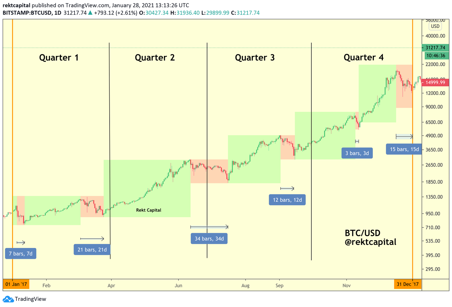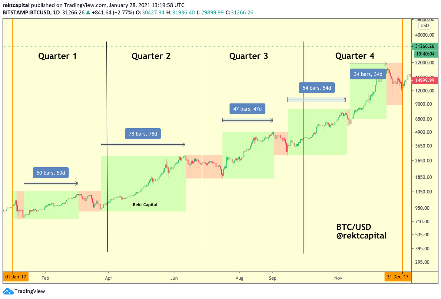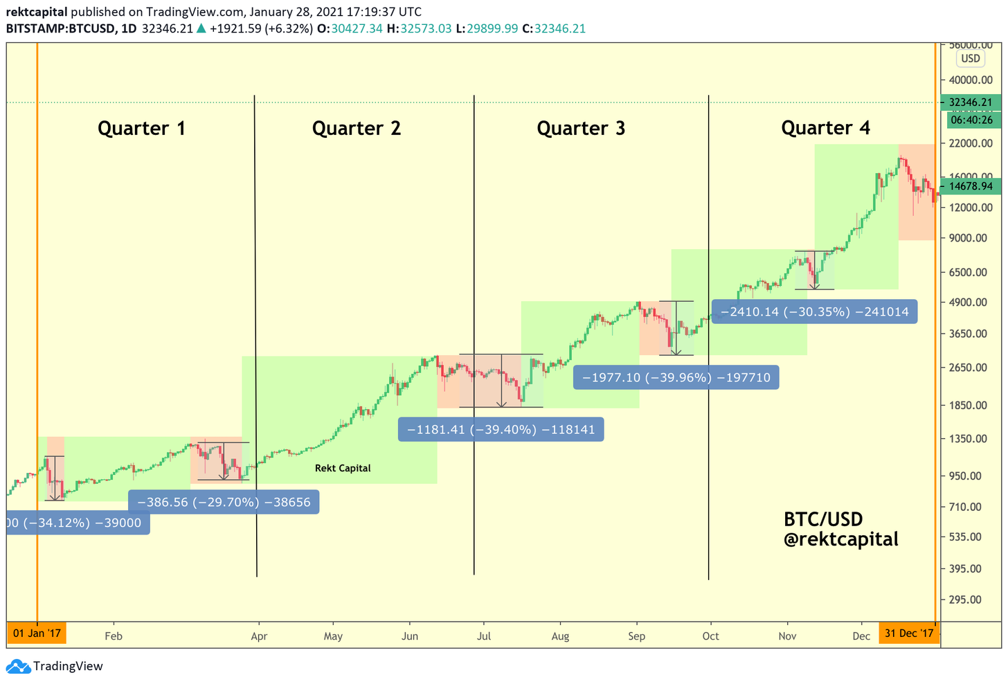 Биткоин находится на бычьем рынке, но это не означает, что в один момент цена не откатится к более низким уровням. Такие коррекции являются здоровым и естественным элементом любого цикла роста. После их окончания цена биткоина склонна выстреливать вверх, преодолевая предыдущие максимумы. Аналитик Rekt Capital оценил поведение биткоина на бычьем рынке 2017 года, разбив его на кварталы для лучшего описания коррекций и следовавших за ними этапов роста.