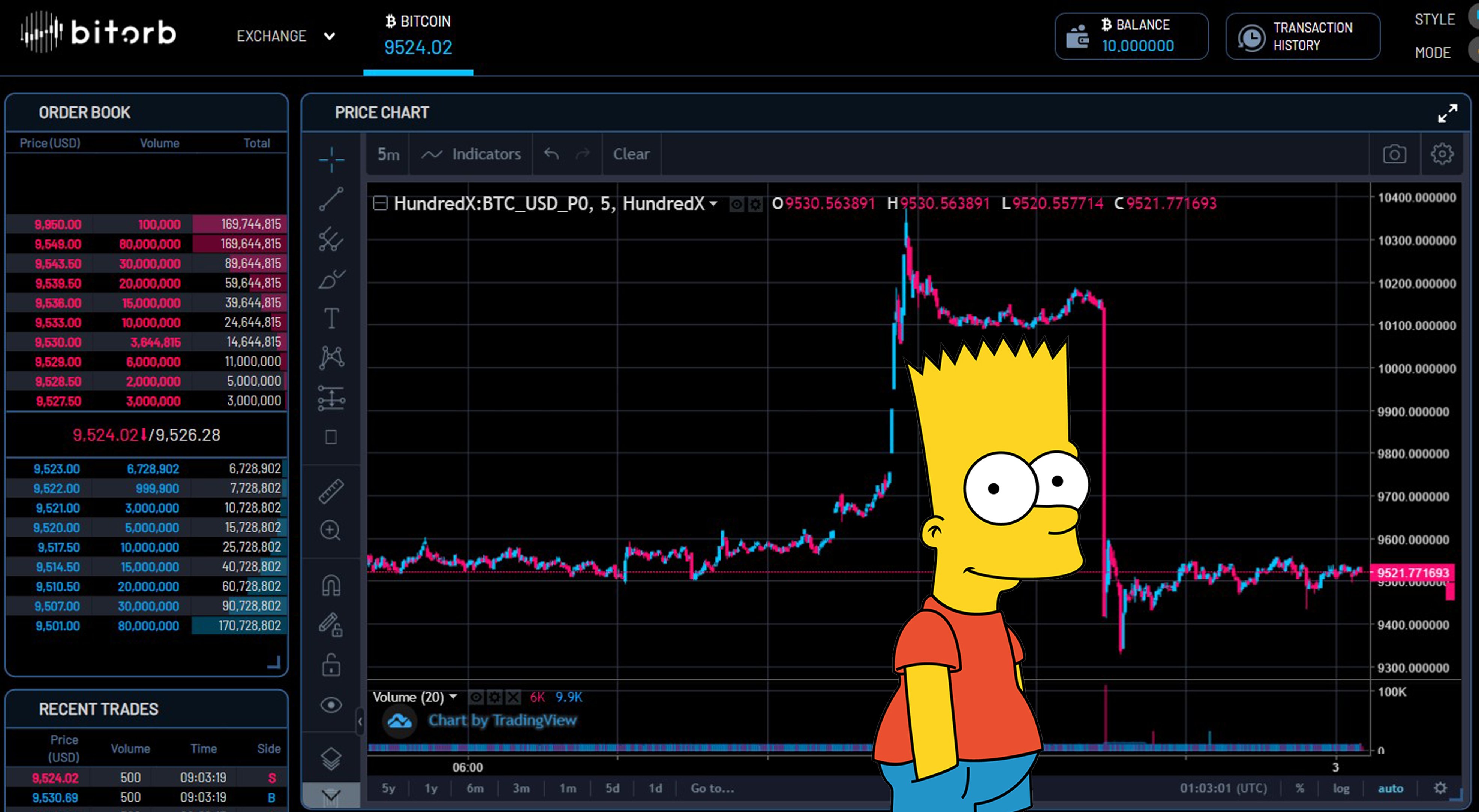 Данный паттерн получил свое название из-за схожести с головой мультипликационного персонажа и в таком виде проявляется почти исключительно на рынке криптовалют. Это связано с манипуляциями, направленными на формирование ликвидности по завышенным ценам. Он характеризуется резким подъемом курса, переходящим в боковой тренд, за которым следует не менее резкое падение. Одним из признаков «Барта», помогающих отличить его от бычьего флага, является наличие новых максимумов, приближенных к первому. На таких уровнях трейдеры обычно покупают, видя прорыв сопротивления, или размещают стоп-ордера для коротких позиций.