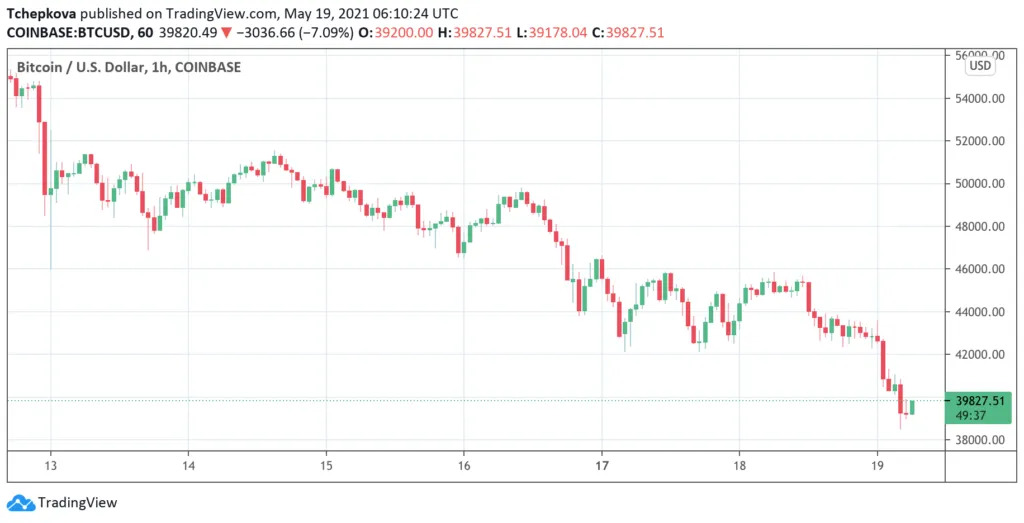 Биткоин упал ниже психологически значимой отметки $40 000 утром в среду, 19 мая, на фоне известий о новых криптовалютных запретах в Китае.