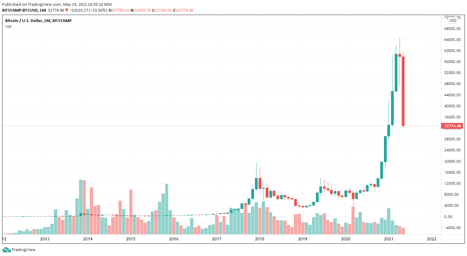 Ранее сегодня биткоин снизился до самой низкой точки за 3 месяца около $36 400. За этим последовал отскок к $39 000, однако в момент подготовки данной публикации за 5 минут курс обвалился на 7,2% и теперь снова обновляет минимумы ниже $33 000, что уже невозможно полностью списать на ликвидацию открытых ранее позиций. Сейчас биткоин торгуется даже ниже уровней 8 февраля, когда Tesla объявила о покупке криптовалюты и запустила ее курс к $65 000.