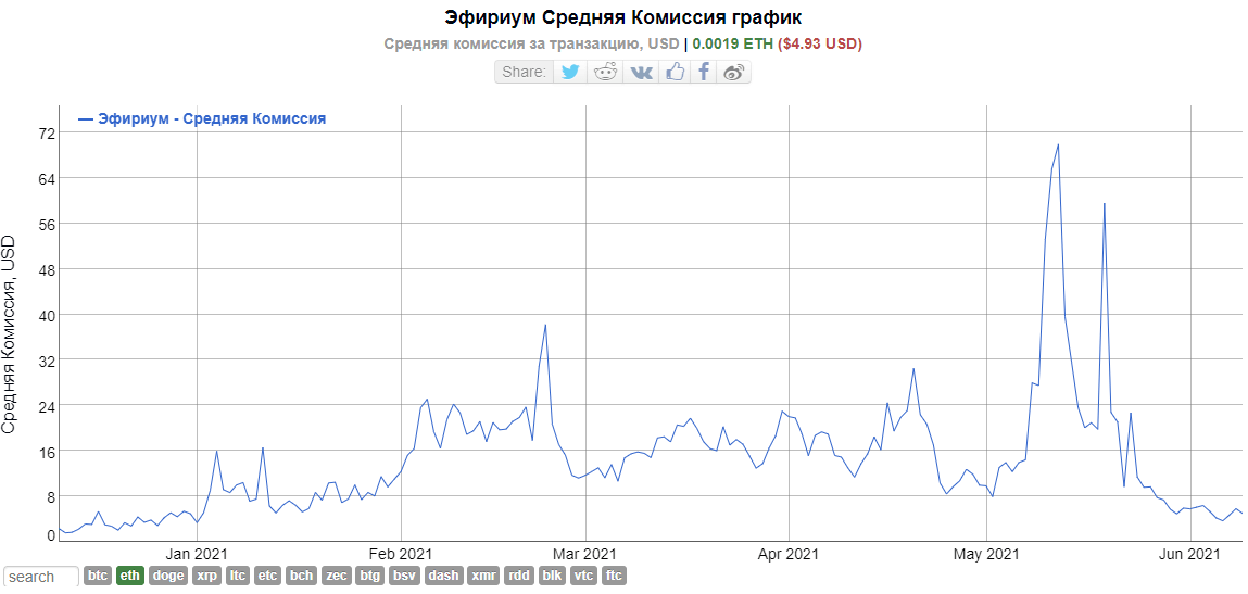 Комиссии за переводы BTC и ETH выросли до рекордных максимумов в апреле и мае соответственно, что совпало с ростом стоимости монет до их локальных максимумов. 24 апреля средняя комиссия за транзакцию Биткоина составила 62.77 доллара — это больше, чем предыдущий рекордный максимум в 55 долларов с декабря 2017 года, который сохранялся более трех лет. Уже спустя пару недель комиссии упали до 4.38 доллара, то есть снижение эквивалентно 93 процентам..