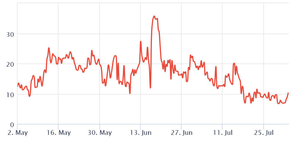 Индикатор перекоса был ниже 12% с 17 июля, что считается нейтральной областью. В результате трейдеры опционов оценивают одинаковые риски как для бычьих, так и для медвежьих опционов.