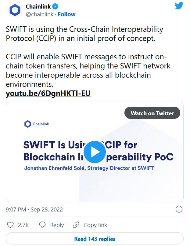 Вчера Chainlink и SWIFT заявили, что трудятся над «первоначальным доказательством концепции» с использованием протокола межсетевого взаимодействия (CCIP) Chainlink, который обеспечивает стандарт для связи между блокчейнами. Это означает, что 11 000 банков, подключенных к SWIFT, смогут участвовать в передаче токенов через блокчейн.