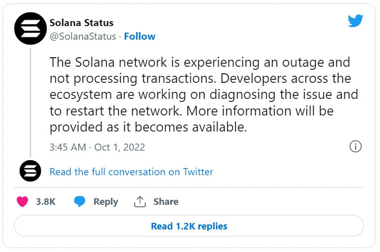 Что произошло? 1 октября в 3:45 мск разработчики Solana сообщили о перебоях в работе сети и приостановке обработки транзакций. Создатели экосистемы проводят диагностику и работают над перезапуском блокчейна. В Twitter они опубликовали инструкцию для валидаторов бета-версии основной сети, а также пообещали обновлять информацию для криптосообщества.