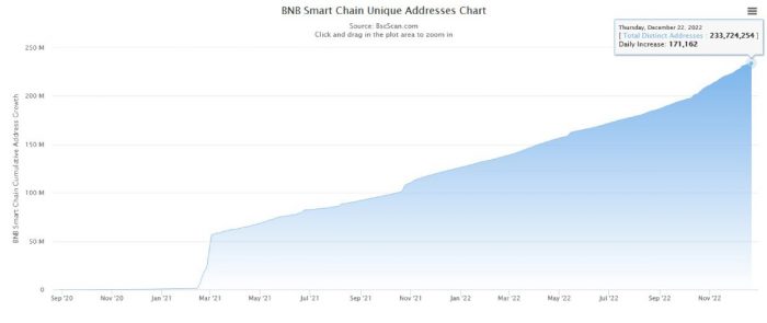 Превзойдя сеть Ethereum, BNB Chain стал крупнейшим в мире блокчейном, а также поставил ещё два рекорда в этом году. В мае BNB Chain обработал максимальное количество транзакций – 9,8 млн, в октябре число активных пользователей сети выросло до пикового показателя 2,2 млн в сутки.