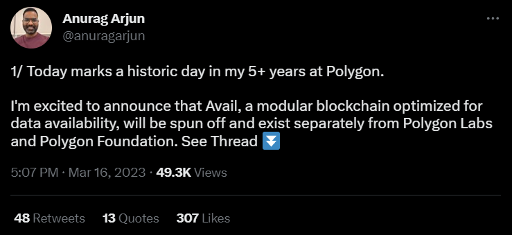 Как говорит Арджун, технологические особенности Avail не вписывались в функционал Polygon, что и подтолкнуло к созданию независимого от сайдчейна проекта. Примечательно, что на фоне новостей с сайта Polygon исчезла страница с описанием технологии Avail, однако сохраненная копия по-прежнему доступна.
