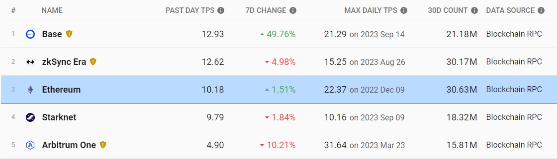 Поддерживаемый Coinbase L2-протокол достиг значения в 12,93 TPS, согласно L2Beat. У zkSync Era показатель оказался на отметке 12,62 TPS, тогда как у основной сети второй по капитализации криптовалюты — 10,18 TPS.