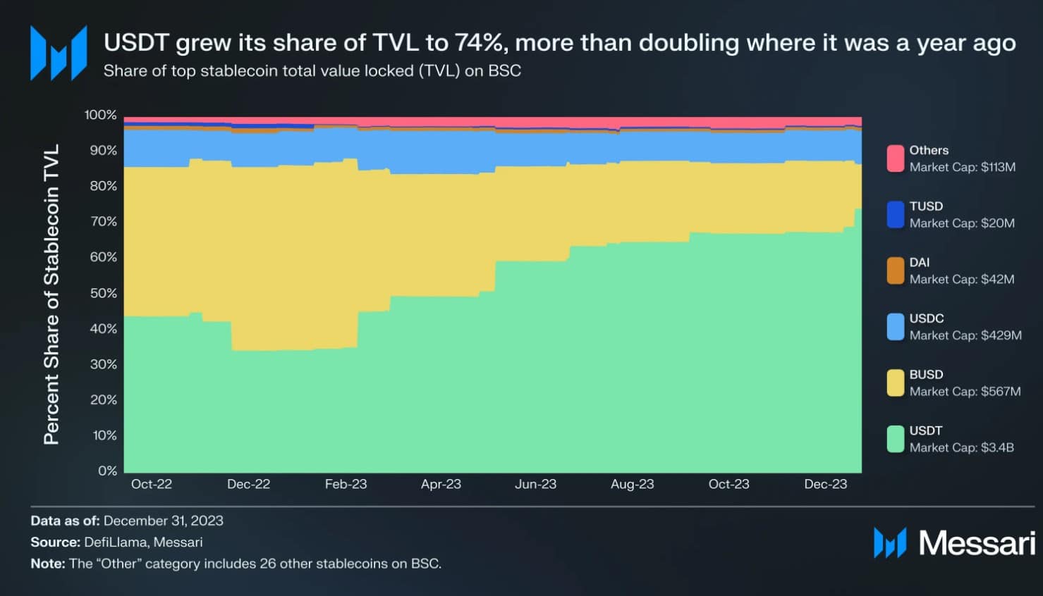 Знаковым событием четвертого квартала 2023 года стал запуск сети $BNB Greenfield, ориентированной на безопасное и децентрализованное хранение данных. Согласно заявлению Messari, она создает инфраструктурный стек для проектов, ориентированных на ИИ и Web3.