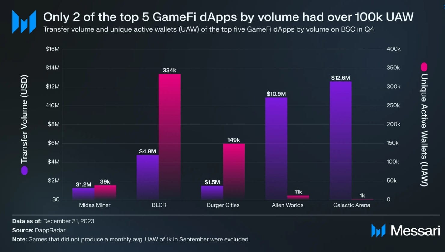 Между тем, эксперты отметили снижение количества транзакций, связанных с вторичными продажами невзаимозаменяемых токенов (NFT). Такие игры, как BLCR и Burger Cities, способствовали созданию более 100 000 новых адресов в четвертом квартале 2023 года.