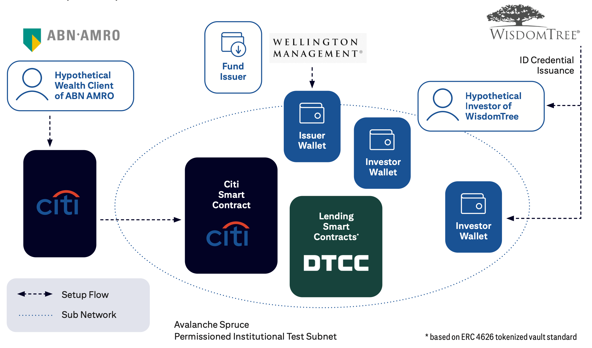 В проекте использовались смоделированные рабочие процессы в фонде прямых инвестиций, выпущенном Wellington Management, при этом ABN AMRO выступал в качестве инвестора, а WisdomTree моделировала платформу в лицензированной подсети Avalanche Evergreen Spruce.