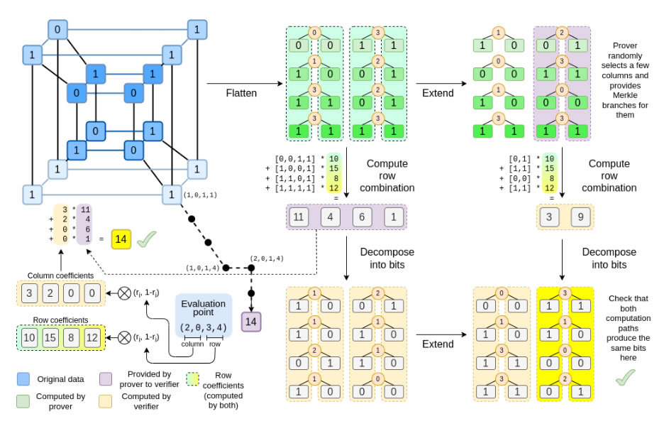 Он также использует специализированный процесс кодирования и декодирования, который преобразует данные на уровне битов в форму, подходящую для «полиномиальной» обработки и доказательств Меркла, сохраняя при этом преимущества эффективности работы в двоичном формате.