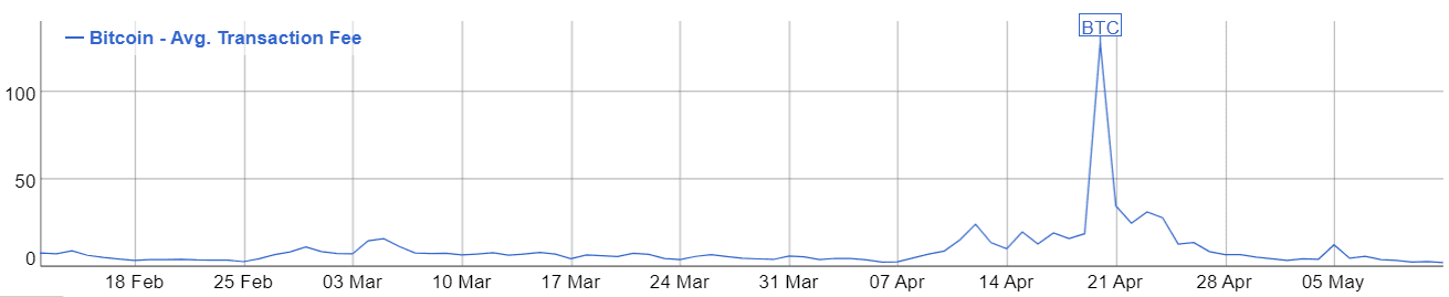 Снижение комиссий, в свою очередь, сказалось на доходе майнеров. В начале мая он упал до многолетнего минимума.
