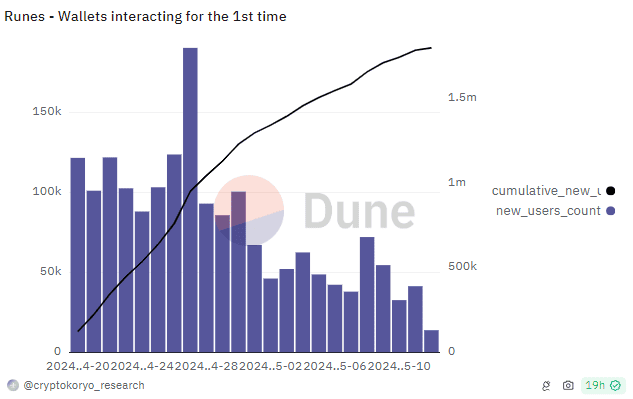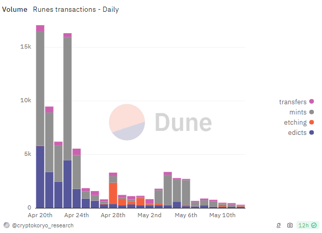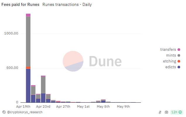 Активность в протоколе Runes постепенно падает с начала мая 2024 года. 12 мая объем комиссий, полученных проектом в сети биткоина, установил новый минимум на уровне в 1,49 BTC, согласно Dune Analytics.