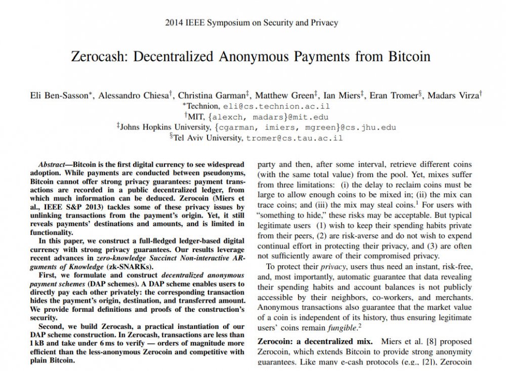 В документе описывается использование кратких неинтерактивных аргументов знания с нулевым разглашением (zk-SNARKS) для создания протокола частных платежей под названием Zerocash, который скрывает происхождение, назначение и количество транзакций.
