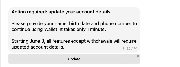 «Начиная с 3 июня для всех функций, кроме вывода средств, потребуются обновленные данные учетной записи», — отмечается в объявлении Wallet.