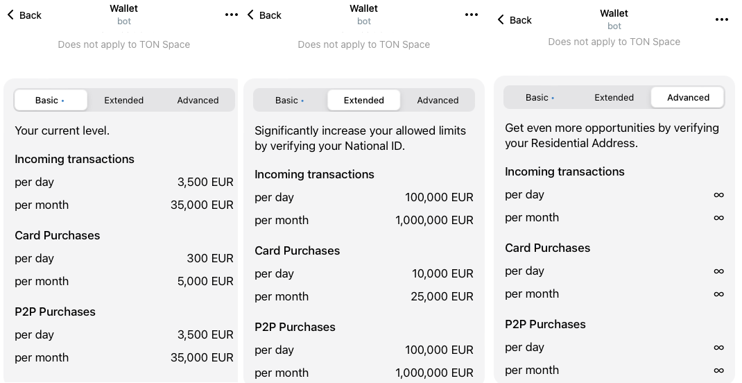 Три уровня идентификации кошелька Telegram Wallet после обновления системы KYC.