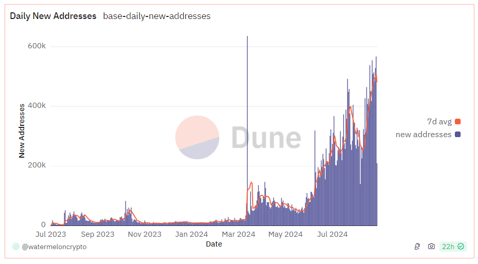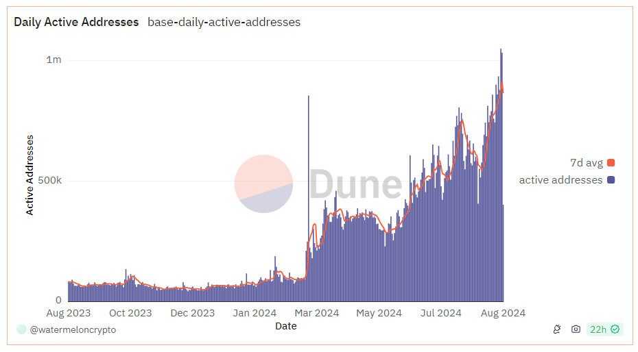 24 августа 2024 года количество активных адресов в сети второго уровня Base превысило 1 млн, согласно Dune Analytics. Это может быть связано с запуском Basenames.