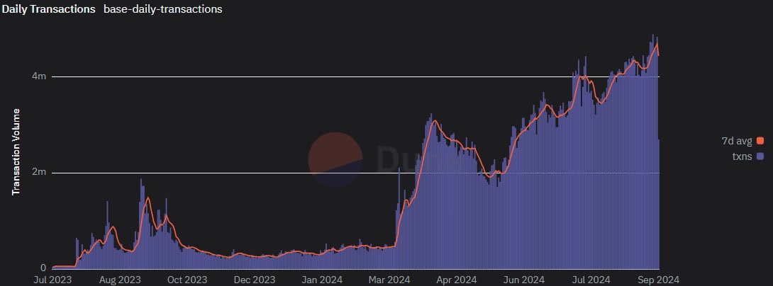13 сентября 2024 года количество транзакций в L2-сети Base составило 4,88 млн, средний показатель за последние семь дней превысил 4,4 млн, согласно Dune Analytics.