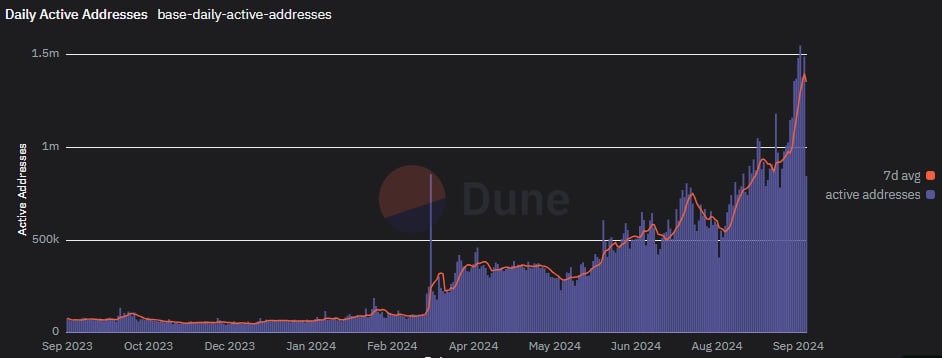 Количество активных адресов в Base также растет. 14 сентября показатель пересек отметку в 1,5 млн, однако уже через три дня упал до около 845 000.