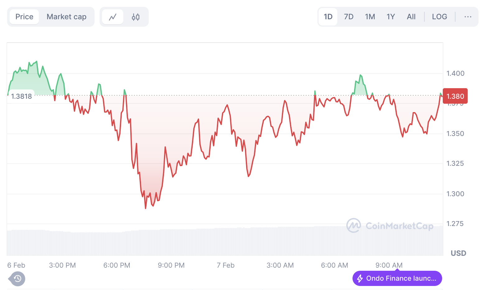 По данным CoinMarketCap, на момент написания этого материала ONDO торгуется по $1,38. За последние сутки цена криптовалюты снизилась на 0,11%. При этом объем торгов монетой вырос на 17% до $705 млн.