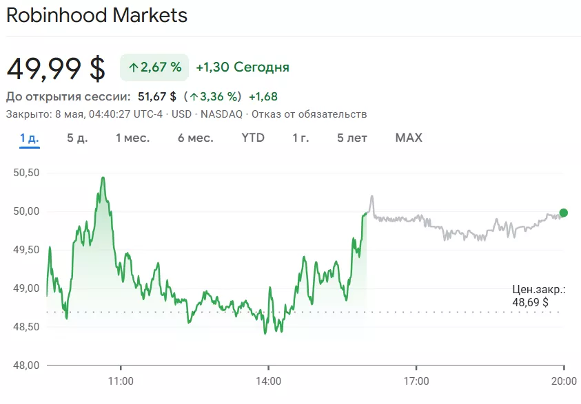 На момент написания акции Robinhood (HOOD) торгуются по $49,99, прибавив за сутки 2,67%.