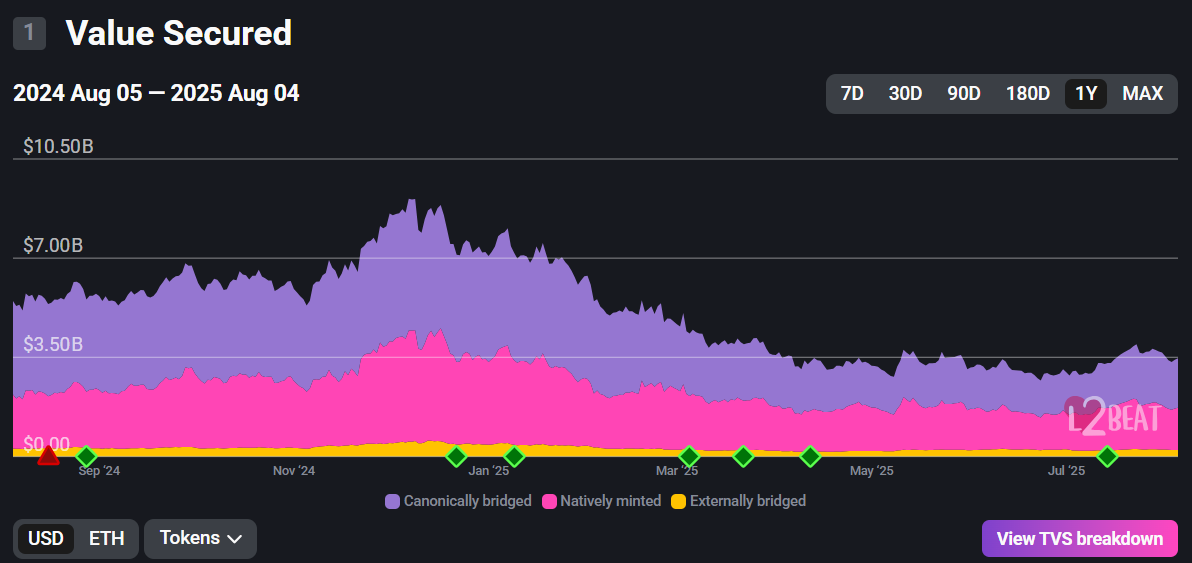 По данным L2Beat, общая защищенная стоимость Optimism составляет $3,46 млрд.