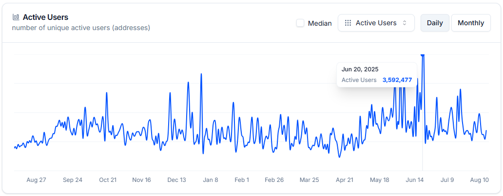 Количество активных пользователей за аналогичный период увеличилось на 1280%, до 1,25 млн. Пиковое суточное значение зафиксировано 20 июня 2025 года на отметке 3,59 млн юзеров.