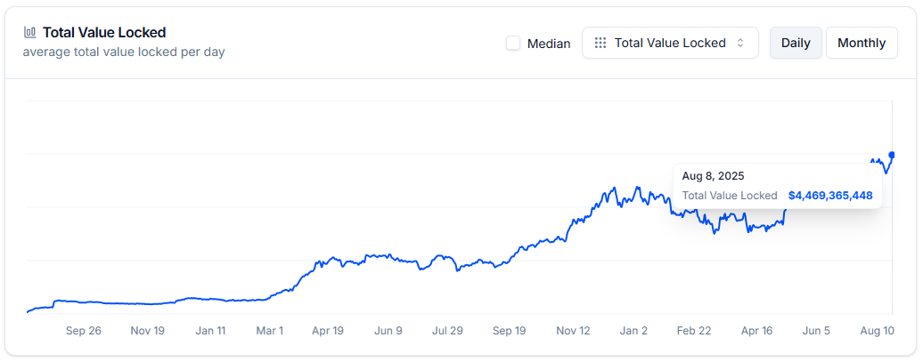 Согласно ончейн-обозревателю, общая заблокированная стоимость в смарт-контрактах решения за прошедший год выросла на 8781% — до $$4,46 млрд.