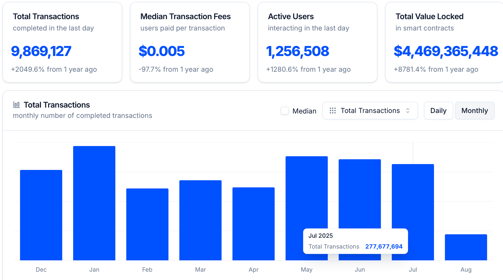 По данным onbase, за последний год совокупная стоимость заблокированных средств (TVL) в сети достигла почти $4,5 млрд. При этом комиссии сократились на 97,7% по сравнению с предыдущим годом.
