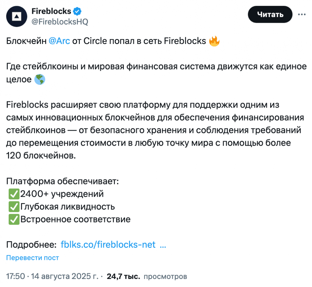 Fireblocks заявила о подготовке функций для хранения и обеспечения соответствия требованиям, чтобы клиенты могли проводить транзакции в Arc после его запуска. Платформа поддерживает более 120 блокчейнов и упрощает проведение расчетов для институциональных участников на глобальных рынках.