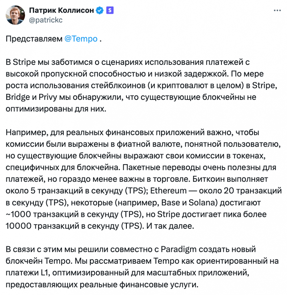 «Мы рассматриваем Tempo как ориентированный на платежи L1, оптимизированный для масштабных приложений реальных финансовых услуг», — сказал Коллисон.