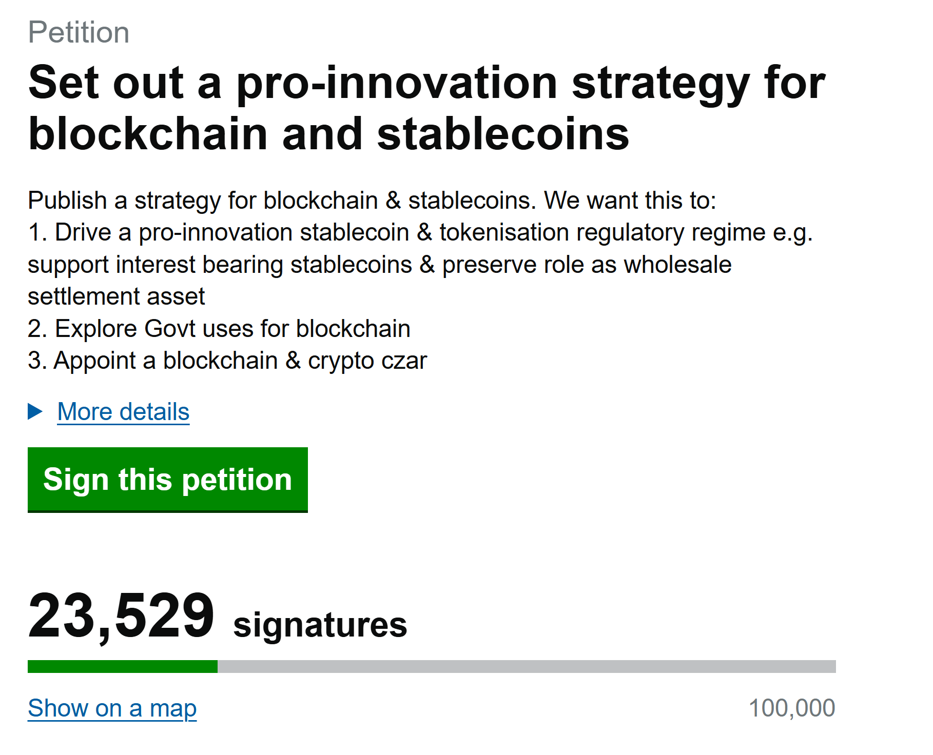 В прошлом месяце Coinbase попросила пользователей поддержать публичную петицию, которая призывает Великобританию разработать стратегию поддержки инноваций в сфере блокчейна и стейблкоинов. Петиция призывает к созданию структуры, включающей регулирование стейблкоинов и токенизации, принятие блокчейна и назначение «царя» блокчейна.