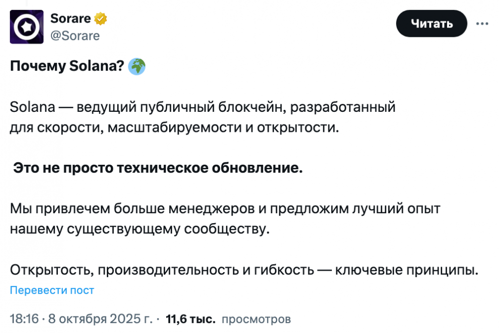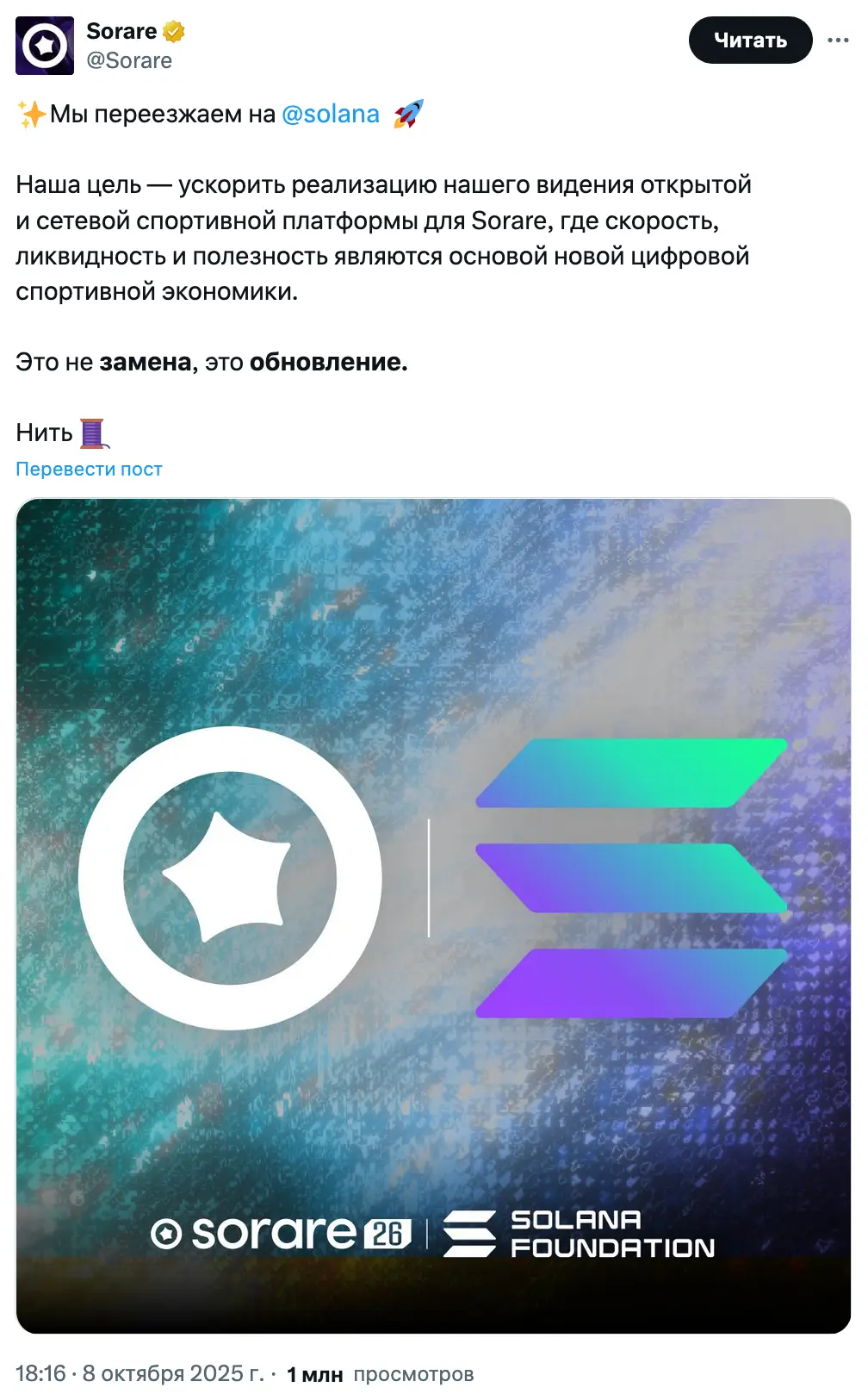 В прошлый четверг Sorare объявила о переходе с Ethereum после шести лет работы на этой платформе. Компания воспользуется преимуществами масштабируемости Solana и ее ориентированностью на потребительский сегмент. В рамках миграции на Solana будут перенесены более 10 спортивных игр и связанные с ними коллекционные карточки.
