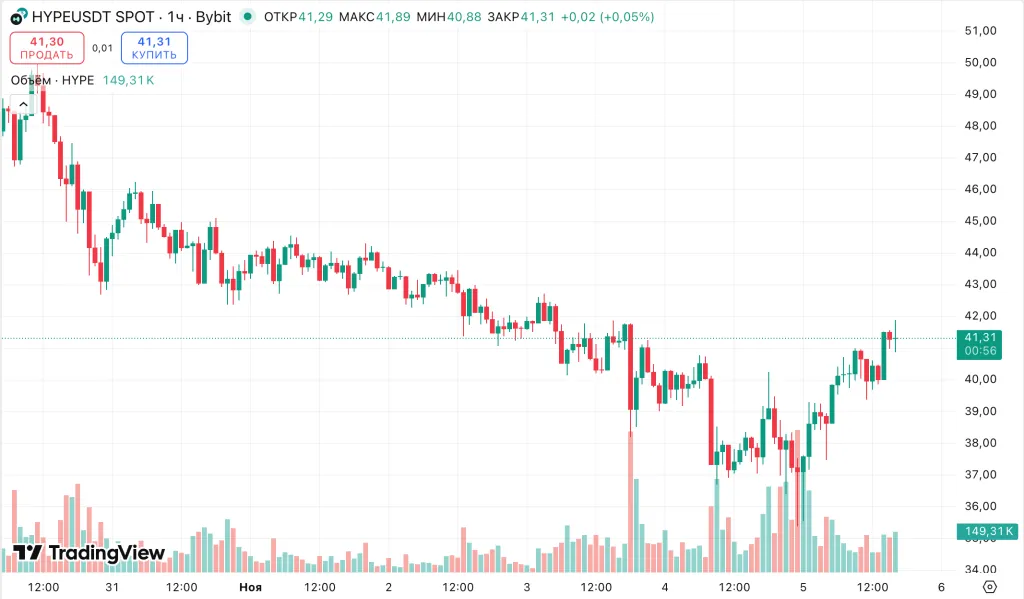 Основа сети — токен HYPE. Его капитализация составляет $11,2 млрд. Сейчас монета торгуется по $41,3, за сутки прибавив 10,4% на фоне падения остального рынка.