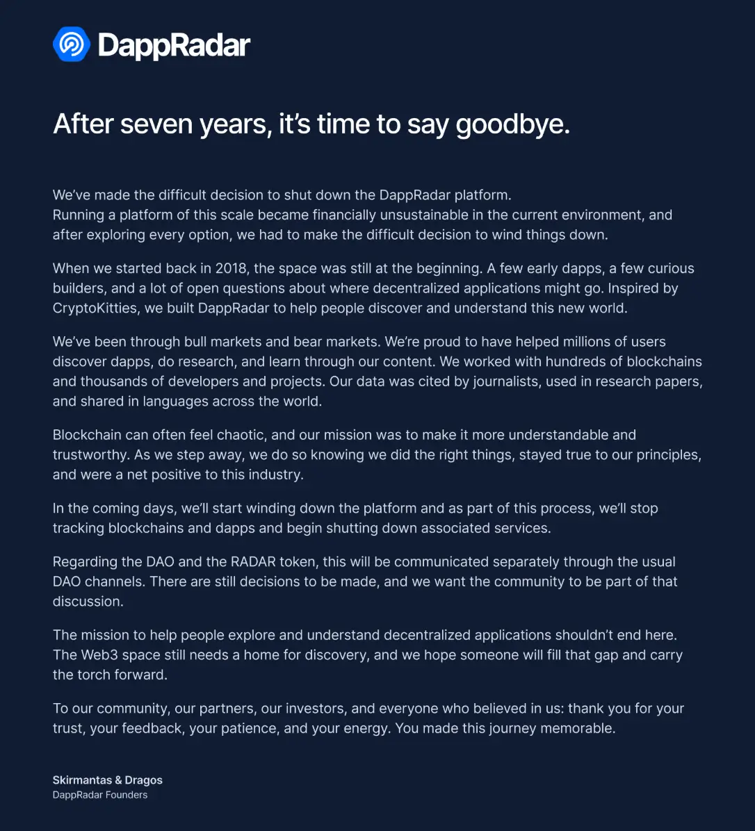 В публикации в понедельник основатели DappRadar Ширмантас Янушкас и Драгос Дуника сообщили о начале процесса свертывания платформы. Они указали, что «содержание платформы такого масштаба стало финансово невыгодным в текущих условиях», и объявили о планах прекратить отслеживание блокчейнов и децентрализованных приложений «в ближайшие дни» по мере начала закрытия.