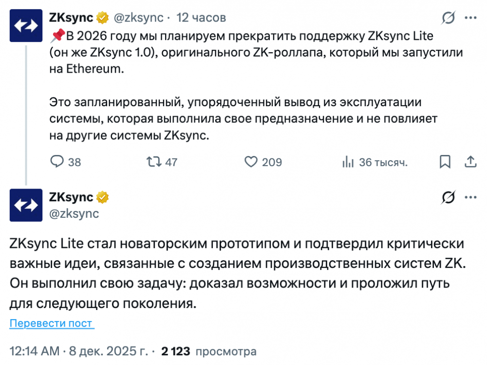 Другие продукты ZKsync также не затронуты. Команда пообещала в ближайшее время опубликовать подробные детали, даты и инструкции по миграции для пользователей ZKsync Lite.