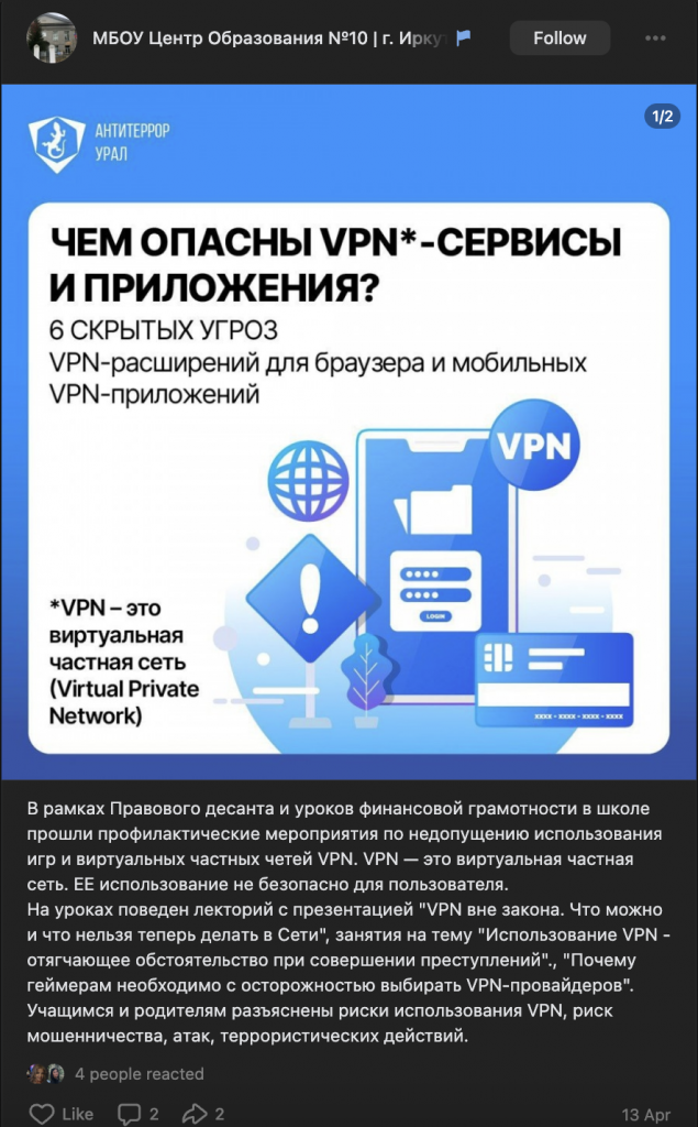 Иркутский Центр образования № 10 опубликовал на странице ВКонтакте информацию о мероприятиях в рамках так называемого правового десанта и уроков финансовой безопасности. В публикации поясняется, что VPN — это виртуальная частная сеть, и её использование «не является безопасным». Лекторий включал тему «недопущения использования игр и виртуальных сетей VPN».