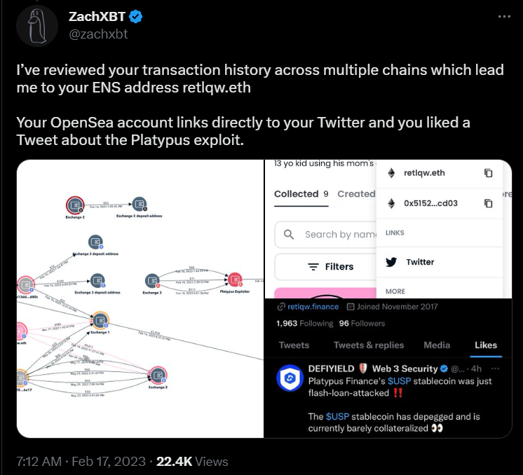 Ончейн-исследователь ZachXBT считает, что за атакой может стоять некий Уолтер под псевдонимом «retlqw». Проследив историю переводов, аналитик пришел к выводу, что похищенные средства в конечном итоге контактируют с криптоадресом retlqw.eth.