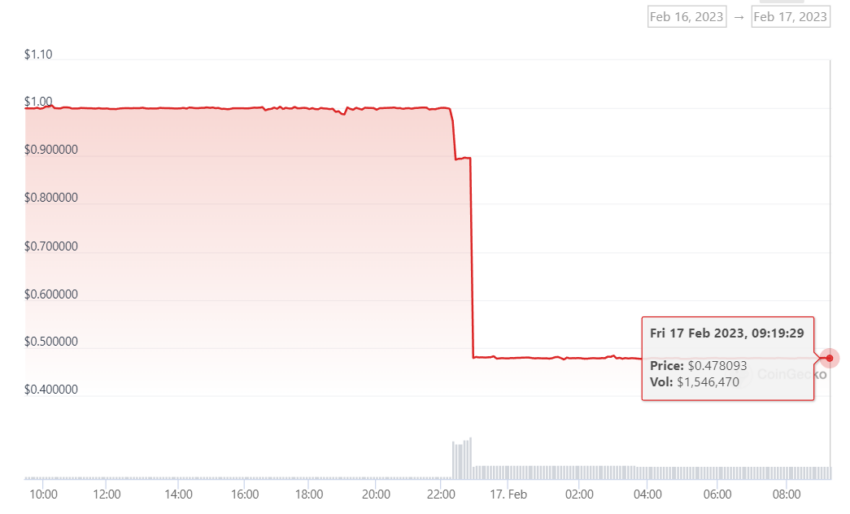 На фоне атаки нативный стейблкоин проекта platypus USD (USP) утратил привязку к доллару США и рухнул более чем на 50%. На момент написания материала котировки USP составляют $0,47.