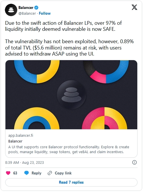 Что произошло? Команда Balancer сообщила о наличии критической уязвимости, которая могла затронуть некоторые пулы для стекинга второй версии DeFi-протокола. По их словам, по состоянию на 23 августа свыше 97% ликвидности, находившихся под угрозой, уже в безопасности благодаря оперативным действиям поставщиков ликвидности. Вместе с тем риски остаются для 0,89% от общей заблокированной стоимости (TVL) проекта, и пользователей призвали как можно скорее вывести средства через интерфейс.