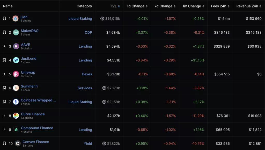 Объем заблокированных средств (TVL) в DeFi-протоколах почти не изменился — $38,09 млрд. Лидером стал Lido с показателем $14 млрд, а вторую и третью строчки рейтинга удерживают MakerDAO ($4,68 млрд) и AAVE ($4,59 млрд) соответственно.