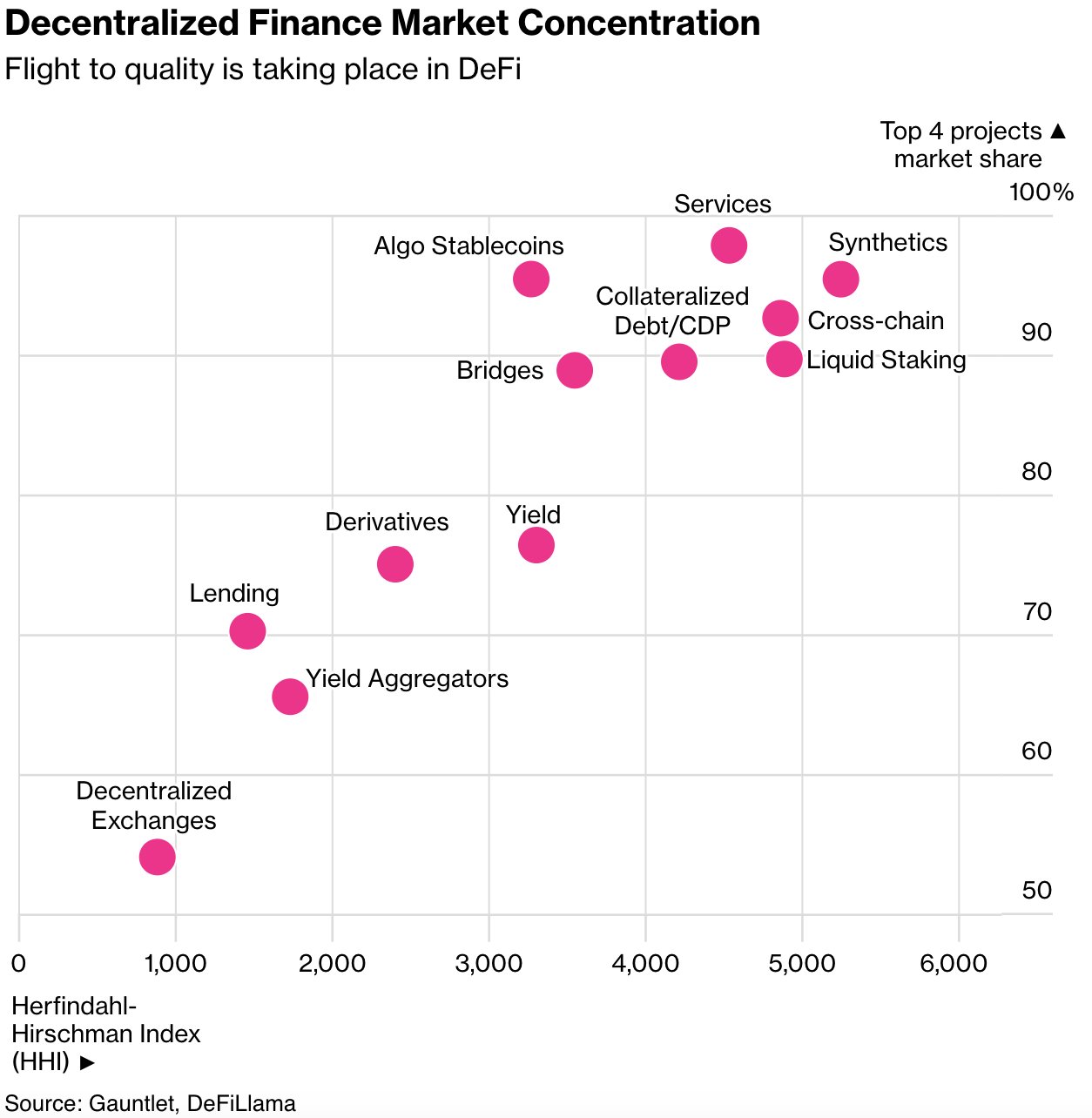 В большинстве направлений DeFi основной капитал сконцентрирован у нескольких крупных проектов. Об этом говорится в отчете Gauntlet, сообщает Bloomberg.