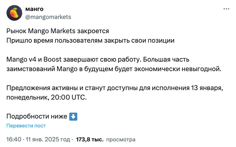 11 января Mango Markets объявила через свой аккаунт X, что она «закрывается» и пользователям пора «закрыть свои позиции».