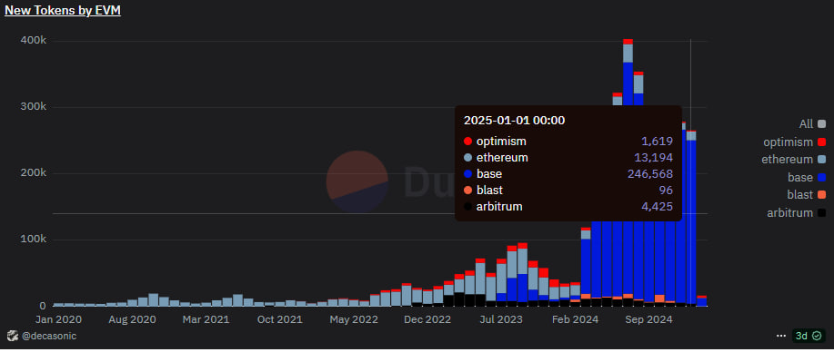 Ethereum продолжает лидировать по объемам торгов, но утрачивает позиции в запуске новых токенов. В конце 2024 года сеть поддерживала от 10 000 до 15 000 новых токенов в месяц, но уже тогда Base опережала Ethereum с более чем 250 000 новых запусков в месяц.