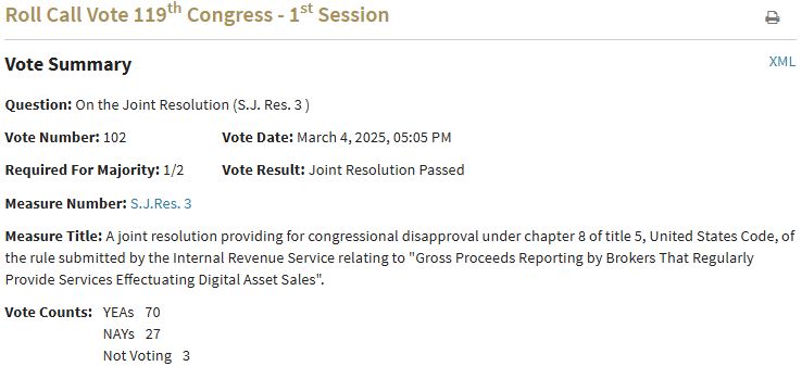 4 марта Сенат проголосовал 70 голосами против 27 за одобрение ходатайства об отмене правила, которое расширит существующие требования к отчетности IRS, включив в него децентрализованные биржи и потребовав от брокеров раскрывать валовую выручку от продажи криптовалют, включая информацию о налогоплательщиках, участвующих в транзакциях.