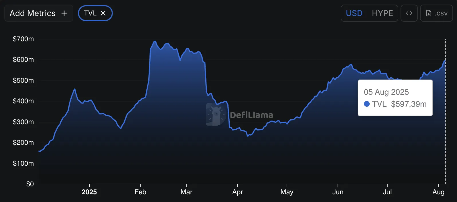 Тем временем TVL Hyperliquid оценивается в $597,39 млн. Это на 15% ниже февральского максимума на уровне $690 млн.