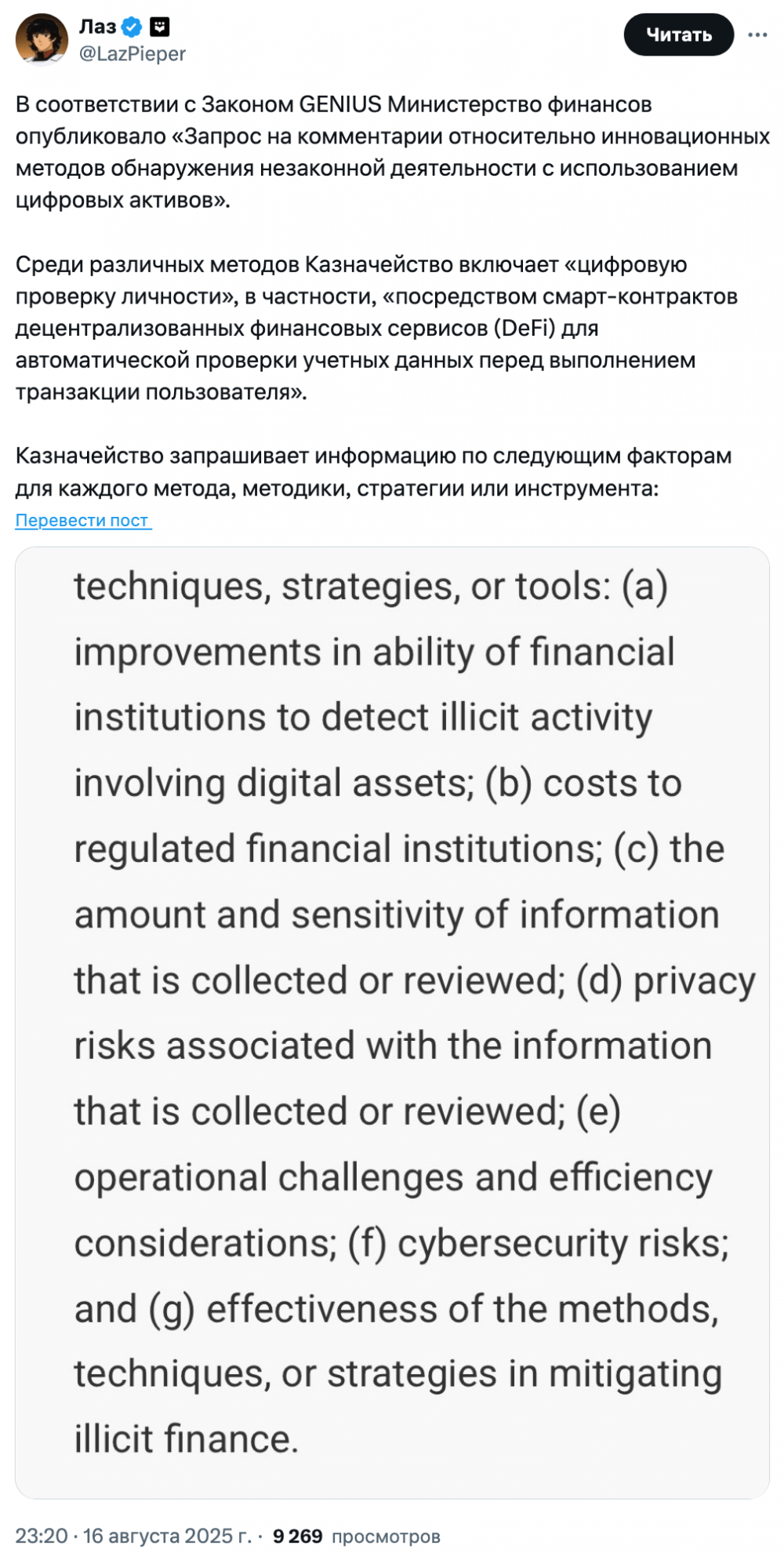 На прошлой неделе агентство начало консультации в рамках Закона о руководстве и создании национальных инноваций для стейблкоинов США (Закон GENIUS), который вступил в силу в июле. Закон предписывает Министерству финансов оценить новые инструменты обеспечения соответствия для борьбы с незаконным финансированием на криптовалютных рынках.